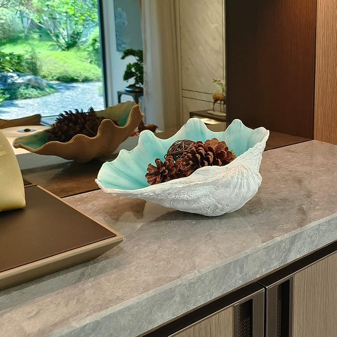 - 【Size】This Turquoise/Aqua blue Seashell decorative bowls made from 100% solid resin, -3.6" tall, 10.23" wide and 8.6" deep approximately. Clamshell decorative bowls Sufficient for home Bathroom Shelf,Room Console,Coffee table,Office Desk,Window Edges and a perfect idea for beach house decor,occasions for beach themed parties or weddings