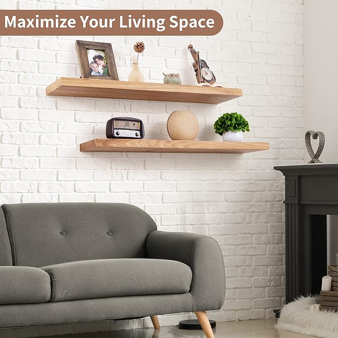 - 8" DEEP-MORE SPACE MORE TIDINESS: Axeman 36 inch floating shelves are designed to be deeper and thicker than traditional floating shelves, with a thickness of 1.37 inches and a depth of 8 inches. You can display a variety of items, such as photos, books, and knickknacks on these sturdy and spacious natural wood floating shelves