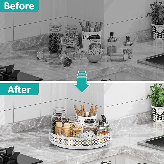 - Durable Metal Meterial: This heavy duty turntable organizer is made of quality anti-rust and waterproof metal.Much more stronger and durable than the plastic spinner organizer. Wear-resistant, abrasion-resistant coating can ensure long lasting usage and it's easy to clean .