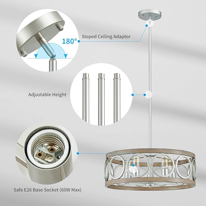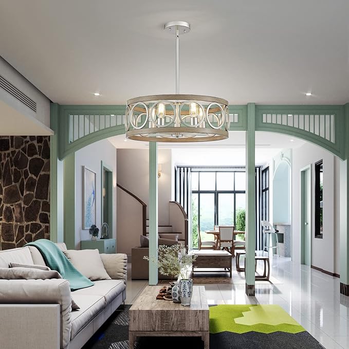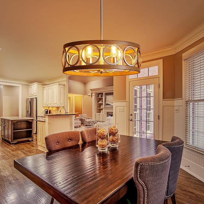 - Perfectly Versatile]: This farmhouse chandelier features a unique open drum frame with an antique wood grain and brushed nickel finish, made of durable metal, not plastic. Its versatile design complements various decorative styles, from modern to farmhouse, and adds brightness to your home kitchen, dining room, or farmhouse-style place.