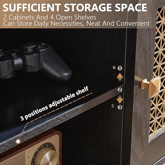 - Thoughtfully Design: This media console includes one exposed shelf at its center, and a cabinet on each side, which provides large storage space. Build-in cable hole, which can organize the messy wires in a standard way