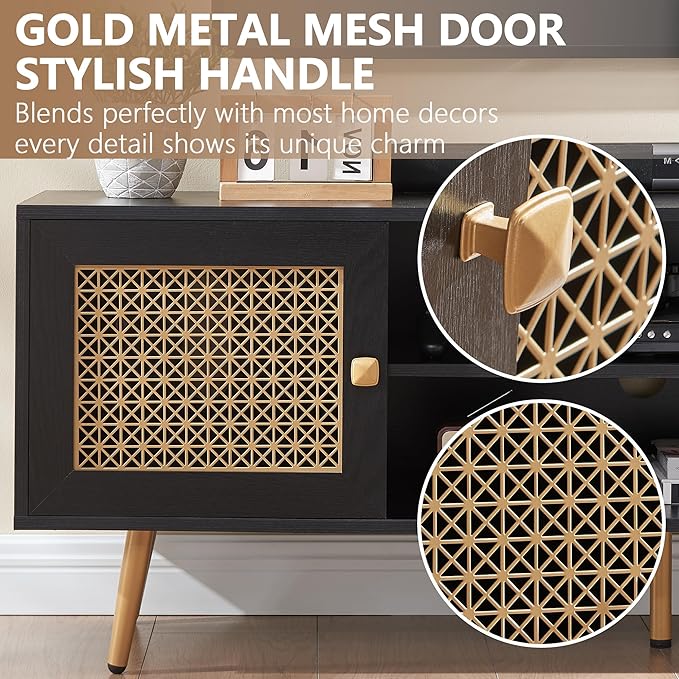 Mid Century Modern TV Stand for 65 inch TV, Entertainment Center with Storage, Metal Mesh Decorated Cabinet Doors for Living Room, Black