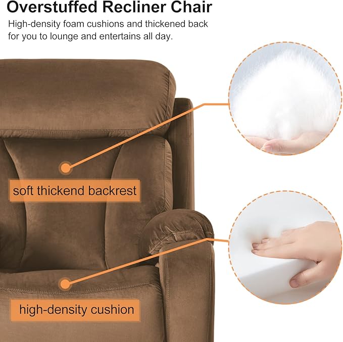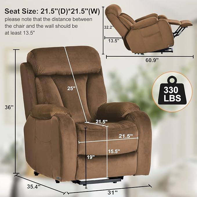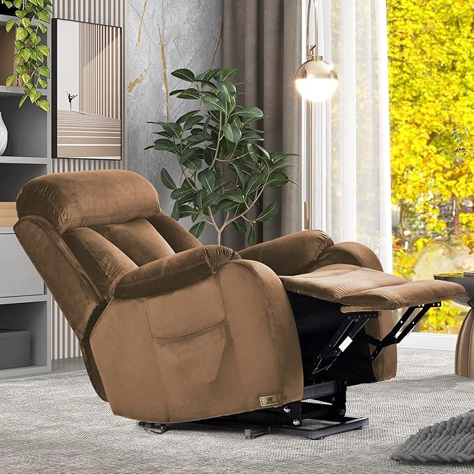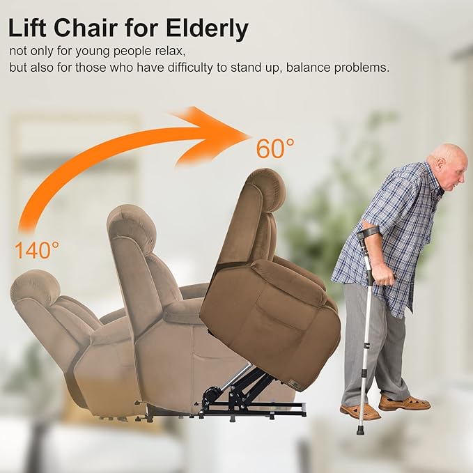 - Comfortable Design : With overstuffed padding, Velvet upholstery material, Thickened pillow and Soft seat design, this power lift recliner chair allows you to have a more comfortable sitting feeling.