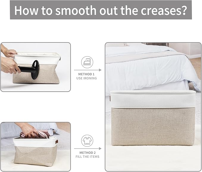 - 【Maintenance & Care Tip】 - Collapsible design for space saving. Our foldable baskets comes in a compression packing which may result in wrinkled storage bin during the long transit. Get rid of the wrinkles by either stuffing the fabric storage bins with blankets and pillows for a few days or steam iron them at low-heat setting. The organization baskets are easy to clean, you can dust the basket with a soft cloth with light soapy water when needed. Not recommended to machine wash.