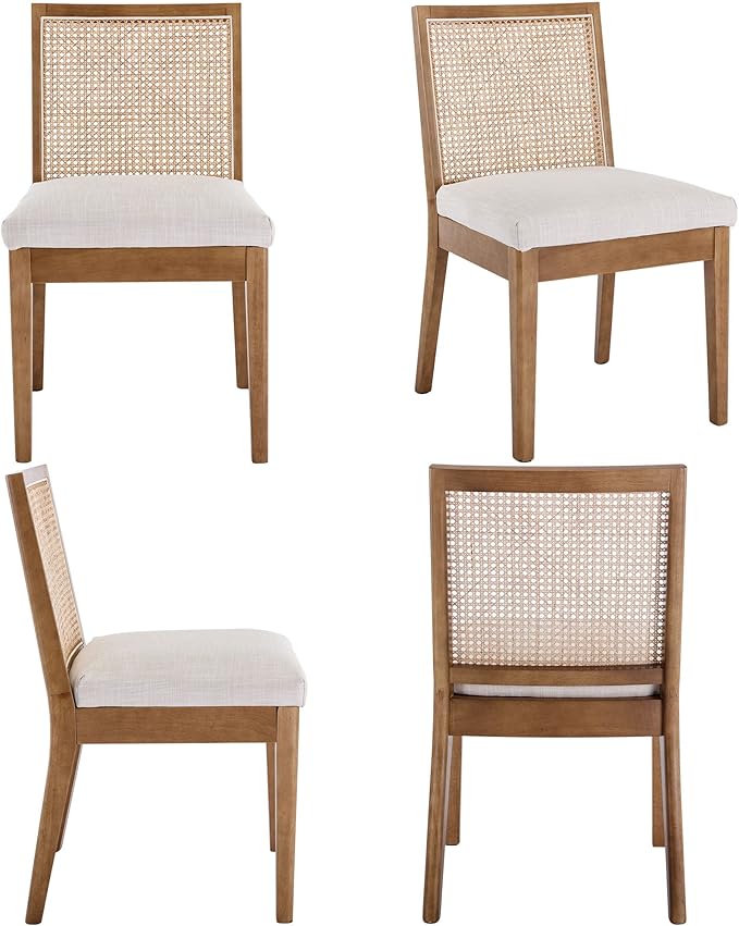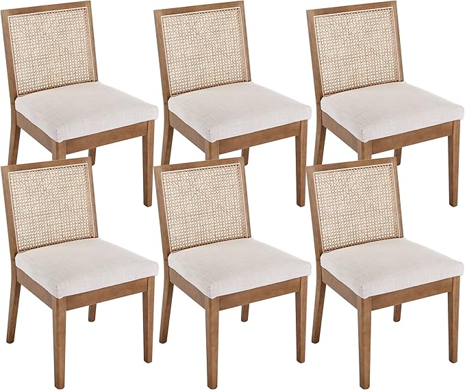 VESCASA Upholstered Dining Chairs with Square Rattan Back, Armless Padded Linen Cushion Dining Chairs with Wood Legs for Dining Room, Kitchen, Set of 6, Natural Frame