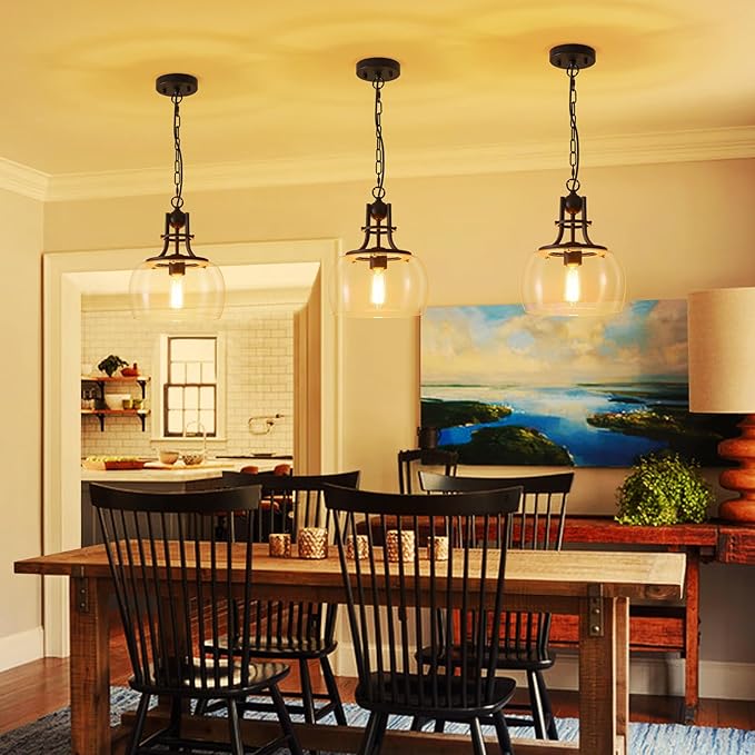 - Design: This rustic farmhouse Wuzups pendant chandelier light with design offers a modern interpretation of a classic urban-industrial style, which adds a vintage flair to your space. It comes in a matte black finish and features a prominent round clear glass shade. The mouth-blown glass has a few pinprick bubbles that add to the vintage look and feel.