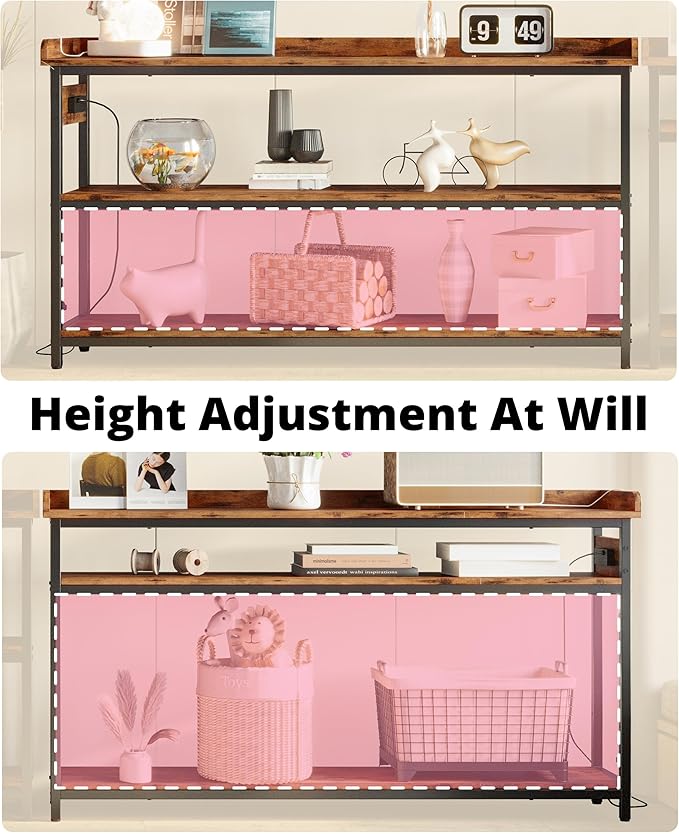 IRONCK Console Table, Sofa Table with Power Outlet, Farmhouse Hallway Table for Entryway, Living Room, Height Adjustable, Easy Assembly, Rustic Brown,55"