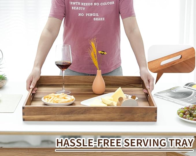 - 【EXTRA LARGE SQUARED WOOD TRAY】This giant wooden serving tray made from a sturdy acacia wood, durable, wipeable, food-safety, beautiful and functional. The big solid square-shaped tray is a good addition to your home.