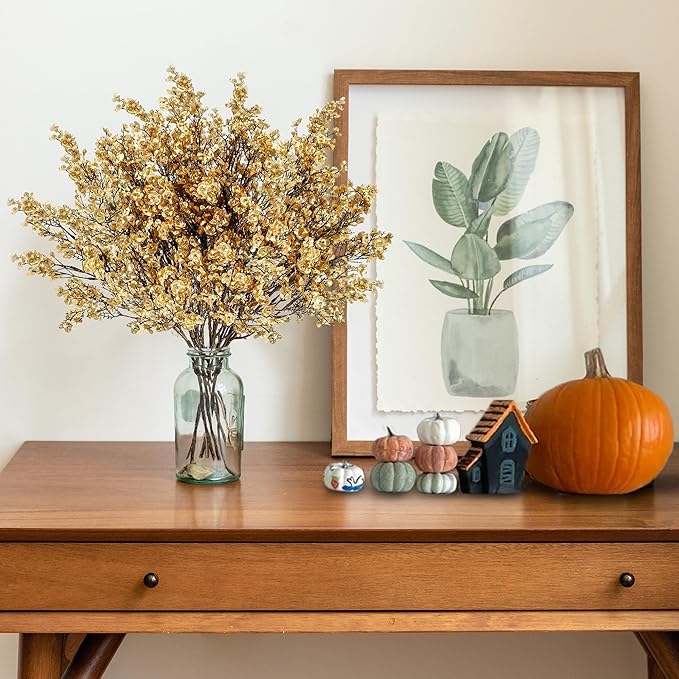 Sggvecsy 15 Pcs Babys Breath Artificial Flowers Gypsophila Bouquets Bulk Real Touch Fake Silk Flowers for Home Wedding DIY Floral Arrangement Kitchen Table Centerpiece Christmas Decoration (Gold)