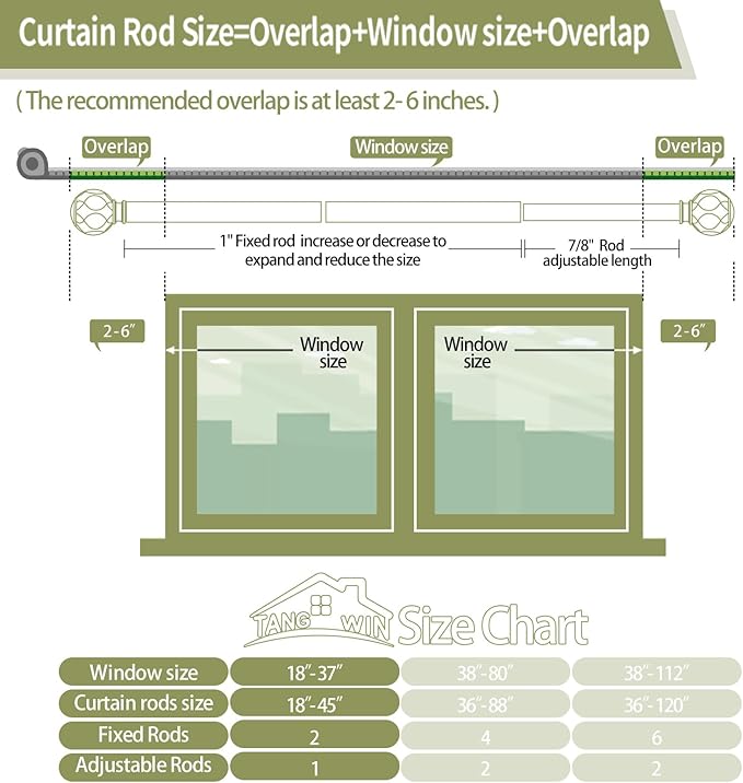 - Curtain Rods for Windows 28 to 48 inch(2.3-4ft): TANGWIN drapery rods include 2 x 16" x 1"fixed rods, 1 x 16" x 7/8"adjustable rods, 2 x finial, 2 x bracket, 1 x connector, 4 x anchor, 4 x screw. Antique white curtain rods for windows can extend from 18 to 45 inches, choose the right size curtain rods according to the length of your window.