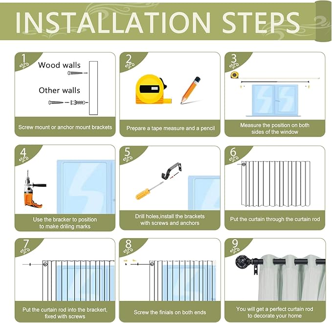 - 2 Pack Easy to Install Curtain Rods: TANGWIN provide detailed illustrated size instructions and modern decorative window curtains rod shipping package has detailed installation instructions inside, follow the steps, 2 pack black curtain rods can easily complete the installation.
