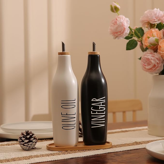 HOMCDALY Olive Oil and Vinegar Dispenser Set, 16oz Ceramic Oil Dispenser for Kitchen, Kitchen Dispenser Bottle for EVOO Vinegar Syrups, Modern Farmhouse Design| Set of 2 – P-Black&White