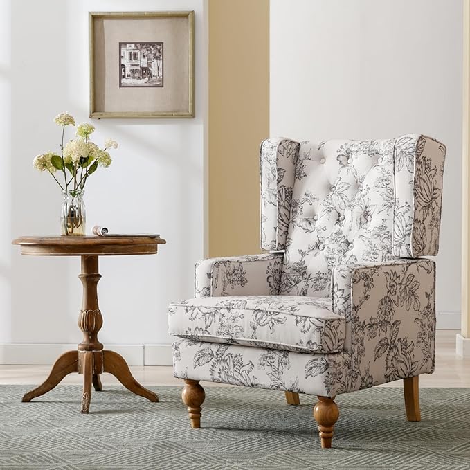 Mid-Century Accent Chair, Upholstered Arm Chair Linen Fabric Side Chair with High Back Solid Wooden Legs, Comfy Reading Chair for Living Room Bedroom, Floral Pattern