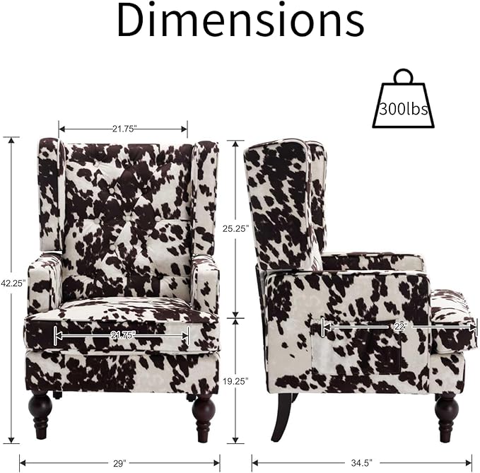 - Dimensions: Overall size: 29’’W x 34.5’’D x 42.25’’H; Seat size: 21.75’’W x 22’’D x 19.25’’H; Back size: 25.25’’H; Weight Capacity: 300 lbs