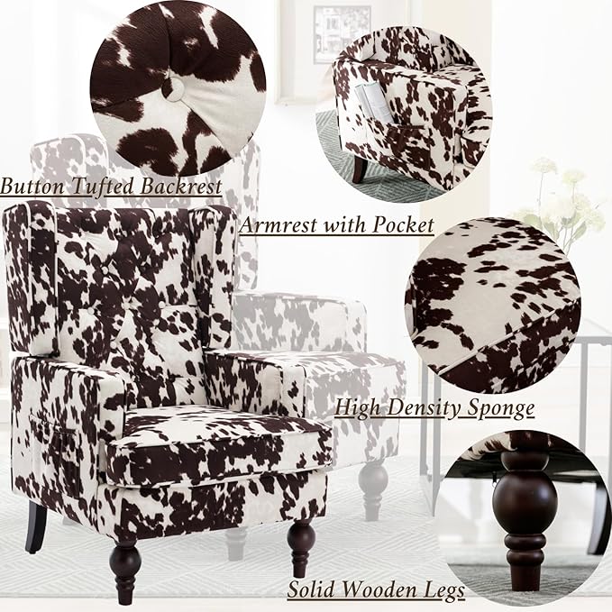 Mid-Century Accent Chair, Upholstered Arm Chair Linen Fabric Side Chair with High Back Solid Wooden Legs, Comfy Reading Chair for Living Room Bedroom, Milk Cow