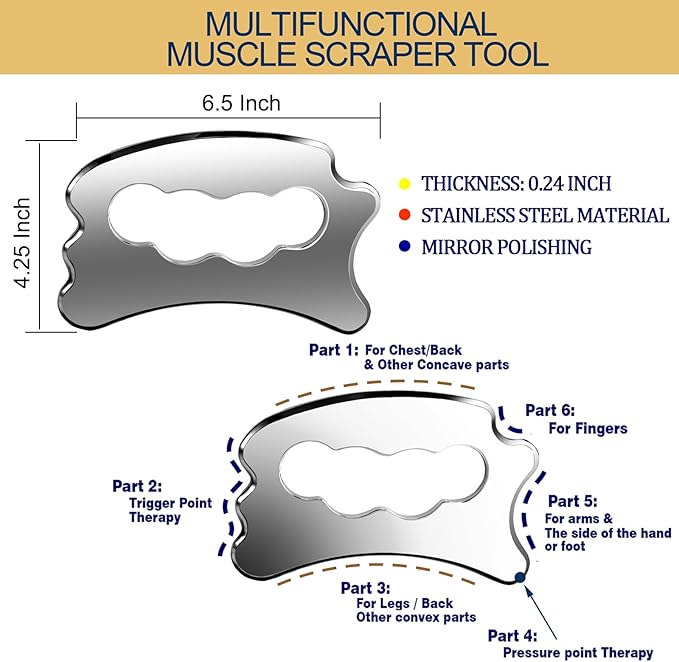 - ♕This Stainless Steel Muscle Scraper Tool can help relieve muscle pain, Soreness and tension, break soft tissue adhesion and fascia limitation, Promote blood circulation,Stimulate regional red blood cell renewal,And enhance skin elasticity and tightness by applying pressure on parts, Scraping muscles and scraping massage