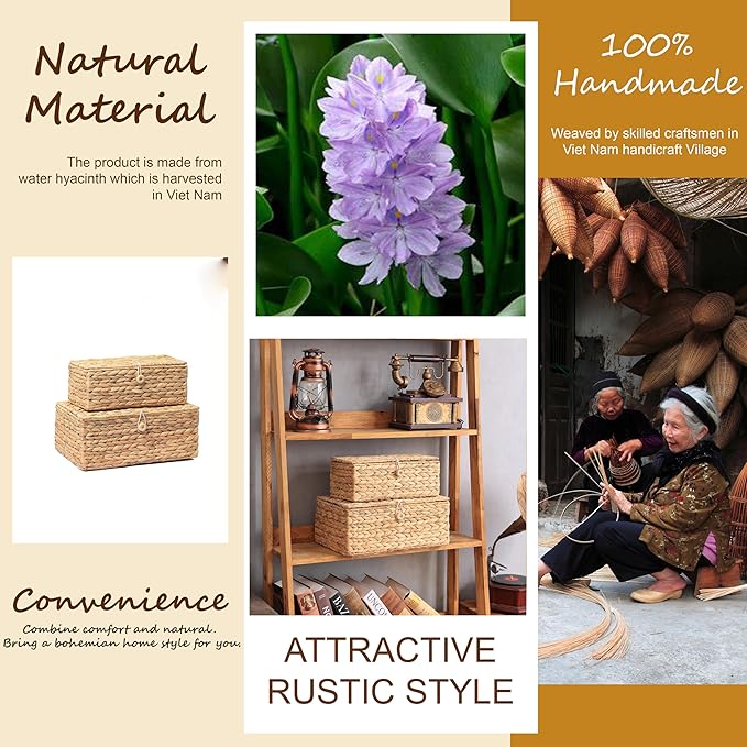 - 🌹 【Durable Material】: Woven boxes is made of 100% natural water hyacinth, so they may vary slightly in shape. The lids open and close easily and prevent dust from settling on the stored contents.