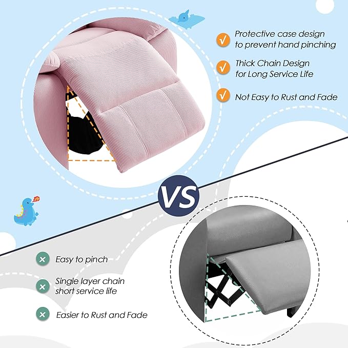 - Sturdy Construction & Safe Design: This kids recliner chair is made of solid wood and iron frames, can be used for a long time. 4 anti-slip and scratch-resistant feet prevent the chair from accidental sliding, the protective cover of the bottom chain can prevent children from accidentally getting pinched, ensuring the safety of the child chair.
