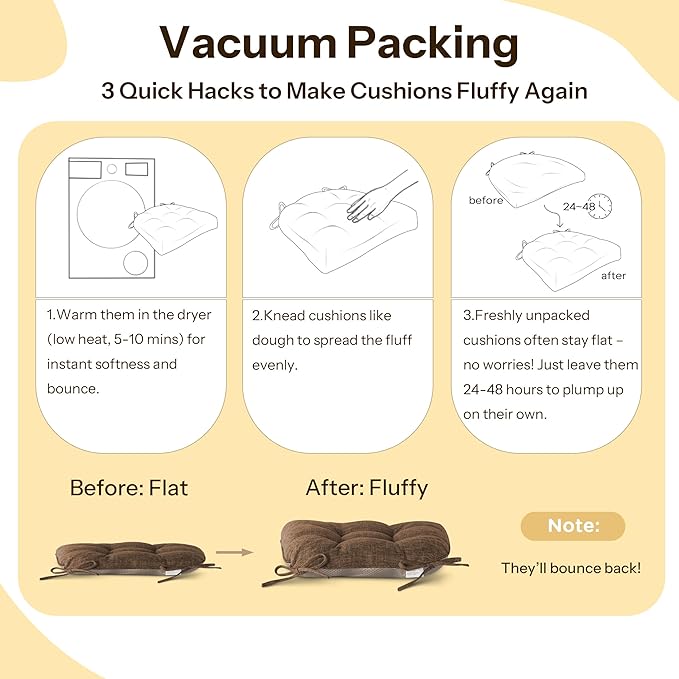 - Large Size Design: Our kitchen chair cushions set of 4 measures 18" x 18" x 3", perfect for most dining chairs, kitchen chairs, and office chairs, instantly transforming hard seats into cozy, stylish seating solutions for any room. The chair cushions for dining chairs are vacuum-packed for shipping. Upon receiving them you can simply follow the easy steps to fluff it for optimal comfort.