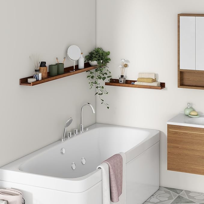 Picture Ledge Wall Shelves 24 inch Width Set of 2, Solid Pine Wood Rustic Floating Ledge Shelves for Wall for Kids' Room Bedroom Kitchen Bathroom Living Room Nursery Display Wall Decor, Walnut