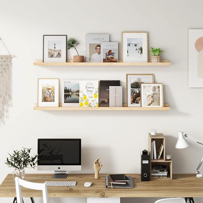 - Easy to Install: You will get a level, screws for the wall, drywall anchors, a detailed installation guide, and two beautiful hand-crafted solid pine wood shelves. With the level, you can make sure your picture ledge shelves are well aligned. Just follow the simple instruction to install the hanging shelves for wall decor within 10 minutes. We add additional screw and anchor to the hardware bag just in case. If you have any questions about our products, please feel free to contact us