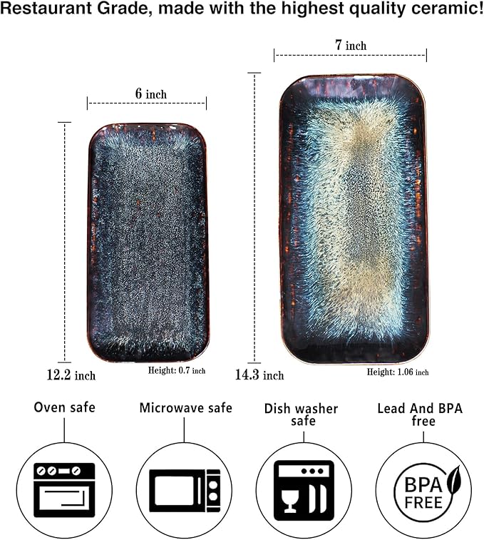 - For All Families: Great size 12.2" x 6" x 0.6" & 14.3" x 7" x 1.06" Set, Perfect for pasta, salad, fruit, Steaks, Platters, Display Plates, without spillage.