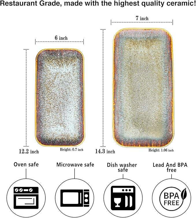 - For All Families: Great size 12.2" x 6" x 0.6" and 14.3" x 7" x 1.06" Set, Perfect for pasta, salad, fruit, Steaks, Platters, Display Plates, without spillage.