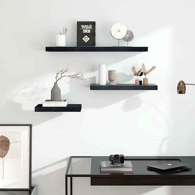 - Rustic & Modern Wooden Floating Shelves - Our shelf is made of durable engineered wood with a natural wood grain finish for a rustic feel. Matte surface makes it modern and minimalist look. It can be mounted and decorated on every wall of your home, perfect for various scenes, whether display your collection or storage.