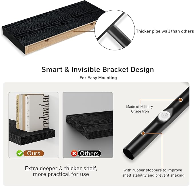 Fun Memories Deep Floating Shelves - 16" W x 9" D x 1.6" H Rustic Black Wall Shelf - Wall Mounted Shelves for Storage - Wooden Shelves with Invisible Brackets for Living Room, Farmhouse - Set of 2