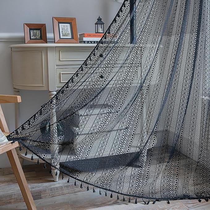 Sutuo Home Black Crochet Boho Curtain 63 Inches Length, Sheer Lace Handmade Tassels Knitted Window Treatment Vintage Rustic Bohemian Farmhouse Drape for Bedroom Rod Pocket 1 Panel 59" W x 63" L