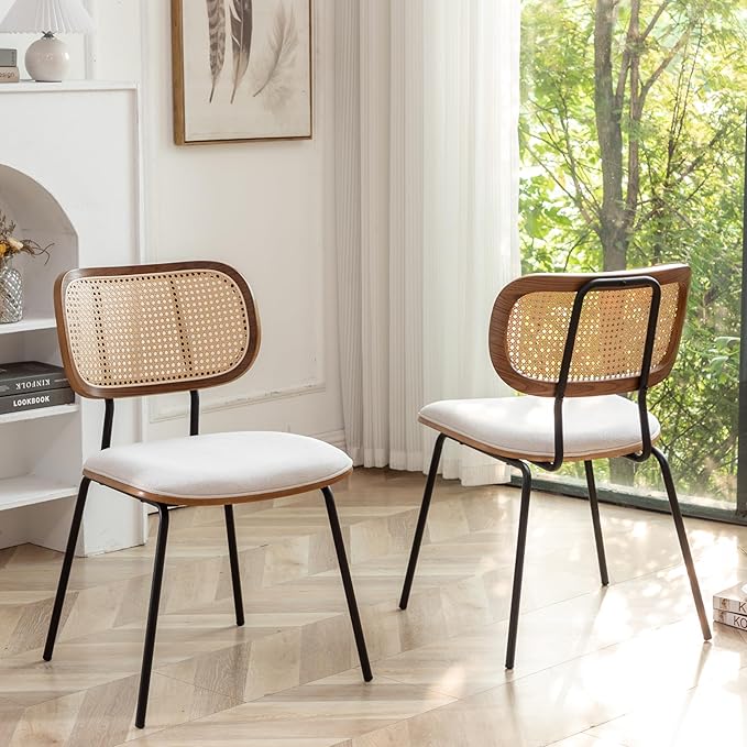 Rattan Dining Chairs Set of 2, Mid Century Modern Dining Chairs with Cane Back for Kitchen Dining Room, 19 Inch Fabric Beige