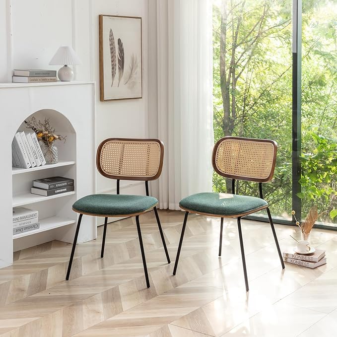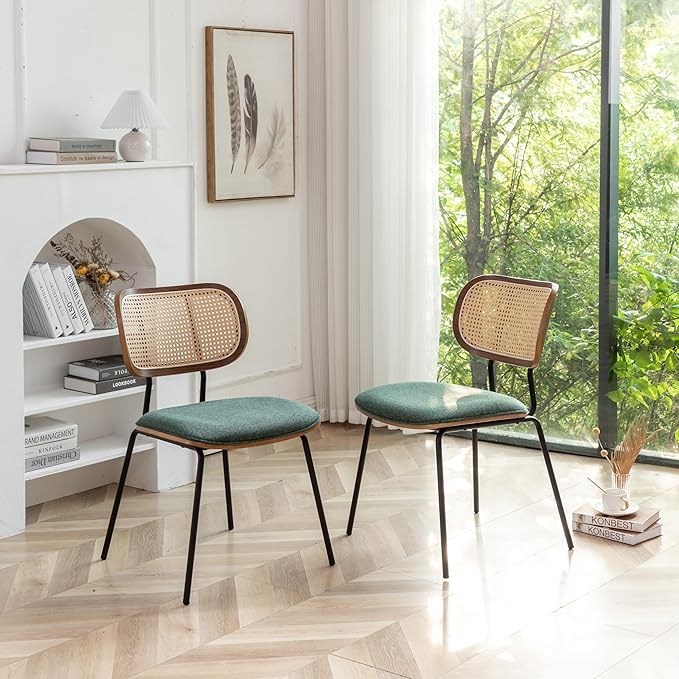 Rattan Dining Chairs Set of 2, Mid Century Modern Dining Chairs with Cane Back for Kitchen Dining Room, 19 Inch Fabric Green