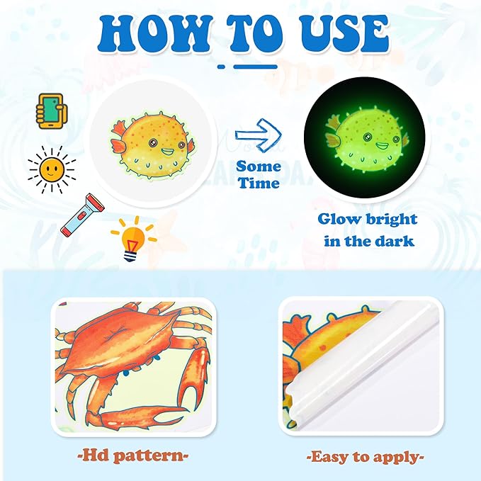 - 【Glow in the Dark】- These underwater wall decals need to absorb light before they emit light. First you need to put them under sunlight,room light or flashlight for 15 to 30 minutes , then turn off the light, the sticker will glowing in the dark.