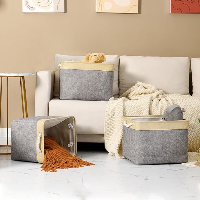 TheWarmHome Storage Basket for Organizing - Fabric Large Cubes 3 Pack 16x12x12 inch Baskets, Cube Storage Bin for Shelves Organizer Closet Cloth Gift Toy (Gold & Grey)