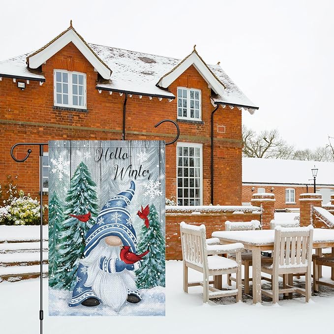 Hello Winter Gnome Garden Flag 12x18 Double Sided Burlap Cardinals Snowflakes Snow Yard Flags for Christmas Seasonal Outside Outdoor House Decoration (ONLY FLAG)