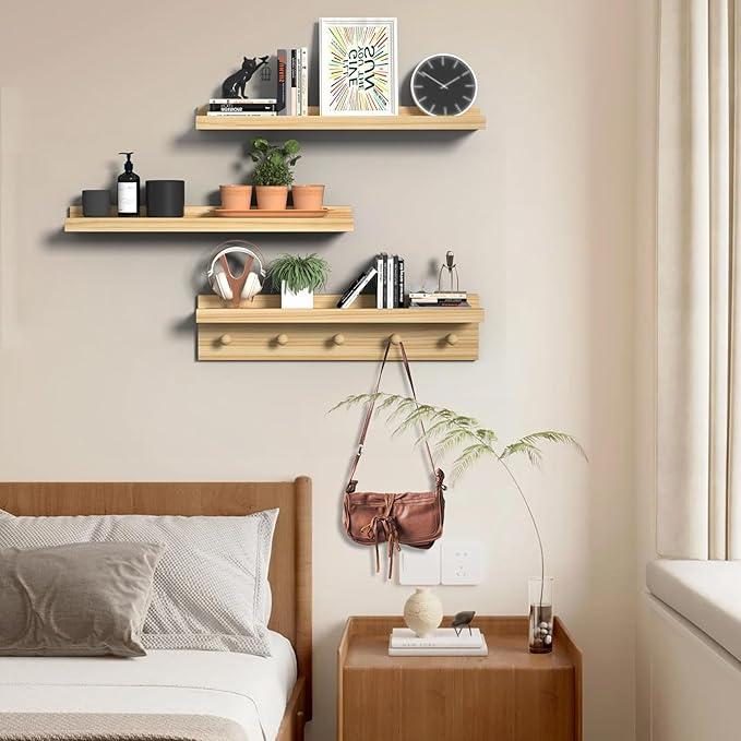 - 100% Pine Wood Craftsmanship: Meticulously fashioned from premium pine wood, the floating shelves and the wooden picture ledge with hooks guarantee exceptional durability. The selection of construction materials has undergone meticulous scrutiny, ensuring an appealing aesthetic while enduring weight and pressure, creating a dependable and steadfast user experience.