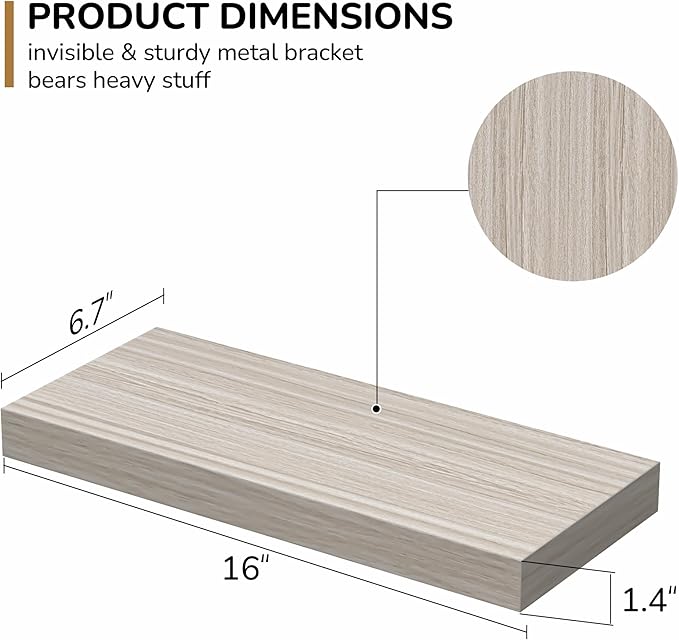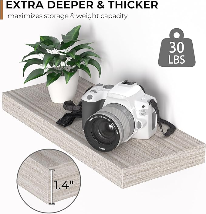 - Extra Deeper & Thicker - Each board measures 16"W x 6.7"D x 1.4"H. Extra deeper and thicker design in order to bring maximizes storage space and weight capacity, even hold up to 30 lb each. This floating shelf taking up zero square feet, reduces clutter and highlights décor in compact spaces.