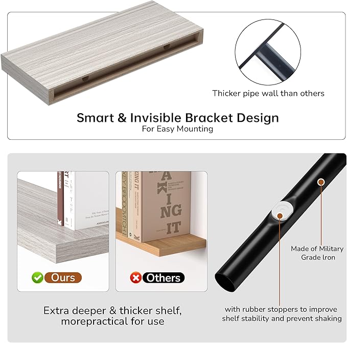 - Easy To Assemble - This floating shelves come with stainless-steel galvanized invisible brackets, toggle bolts for drywall & a simple instruction manual to help you install. The assembly of this wall shelf is very simple, only two boards and some necessary screws and other hardware, and we also have detailed instructions for you to view, you can assemble quickly. Please contact our product support team when you have any questions.