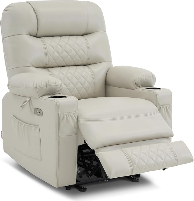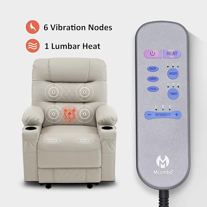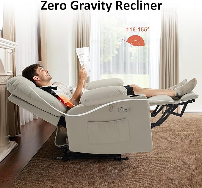 MCombo Zero Gravity Power Recliner Chair with Heat and Vibration Massage, Reclining Chair with USB Ports, Cup Holders for Living Room, Faux Leather PR621 (Light Grey)