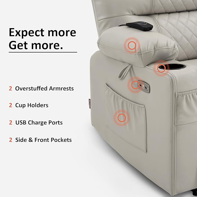 - Convenience at Your Fingertips: The cup holder and the armrest loop keep essentials within easy reach. The USB charging ports allow you to power devices without getting up — everything you need is right at hand