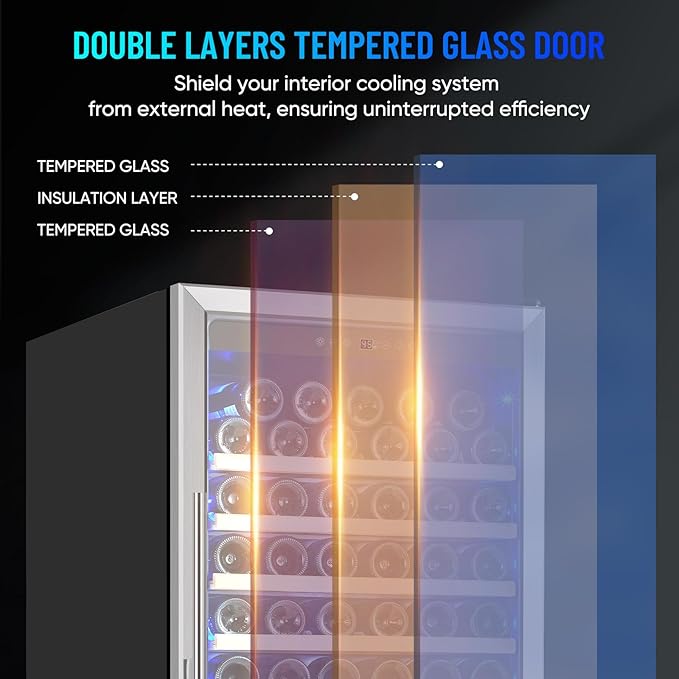 - 【Double-Layer Glass Door and Safety Lock Design】The wine cabinet features a double-layer tempered glass door, presenting a visually appealing wine display. This design effectively insulates against external temperature fluctuations, ensuring wines remain in optimal storage conditions. The safety lock adds an extra layer of security for your valuable collection.
