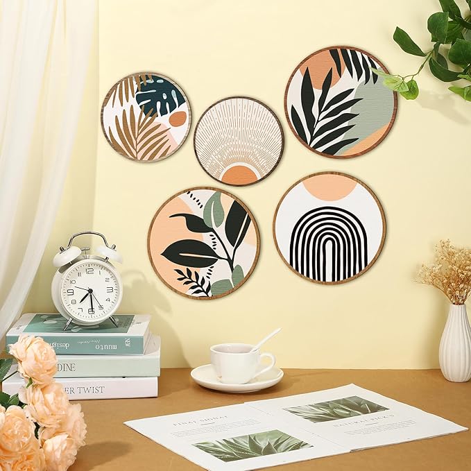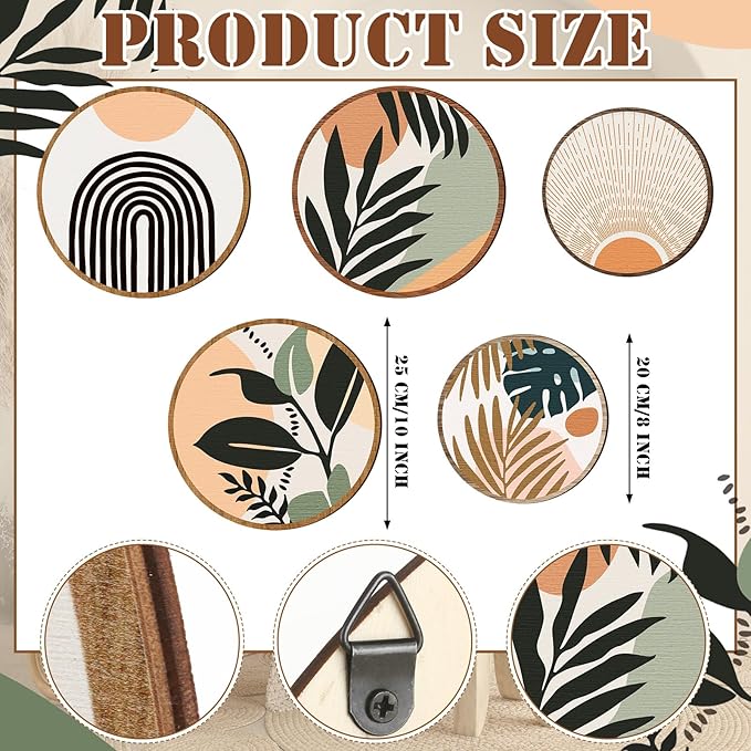 - Proper Size for Display: there are 2 kinds of sizes of the aesthetic wall art, 3 bigger ones measure about 10 inches/ 25 cm in diameter, and 2 smaller ones are about 8 inches/ 20 cm in diameter, all of them are about 0.2 inch/ 0.5 cm in thickness, proper size to catch people's attention
