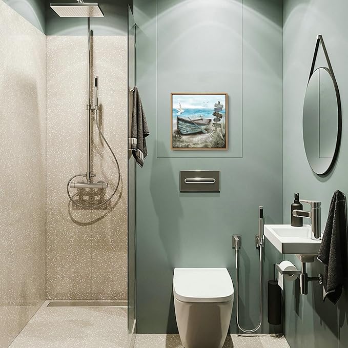 Framed Wall Art Beach Décor Ocean Canvas Picture Coastal Artwork Sea Bird Boat Blue Tan Small Rustic Beachy Canvas Print for Bathroom Bedroom Living Room