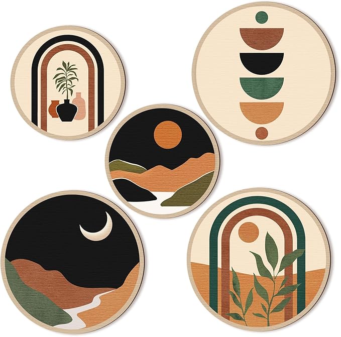 Qunclay 5 Pcs Wall Art Decor Wooden Living Room Wall Decor Bohemian Hanging Farmhouse Geometric 10'' and 8'' Aesthetic Wood Minimalist Posters for Bedroom(Sunset)