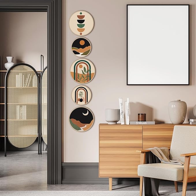 - Proper Size for Display: there are 2 kinds of sizes of the aesthetic wall art, 3 bigger ones measure about 10 inches/ 25 cm in diameter, and 2 smaller ones are about 8 inches/ 20 cm in diameter, all of them are about 0.2 inch/ 0.5 cm in thickness, proper size to catch people's attention
