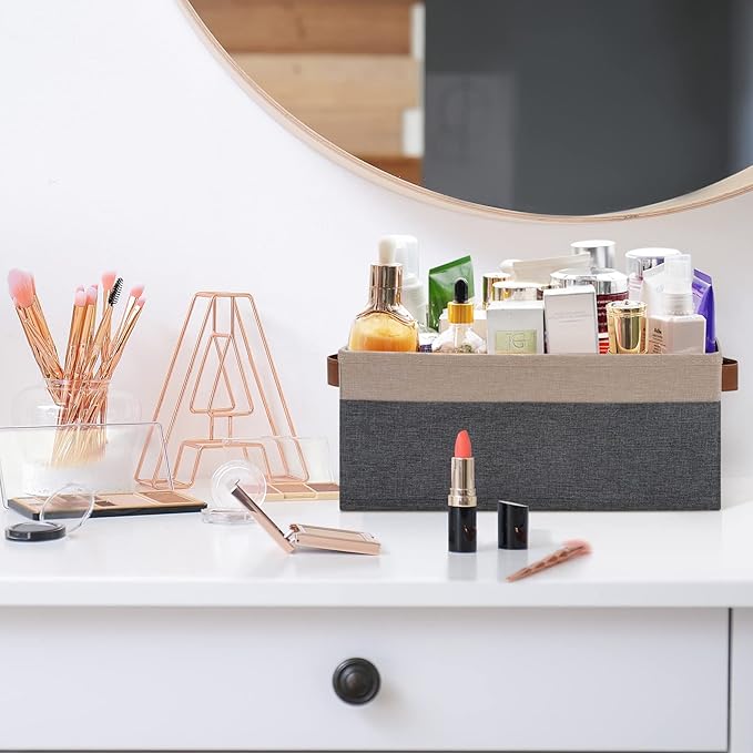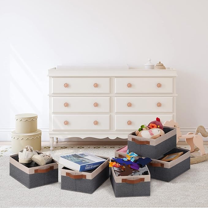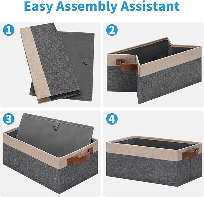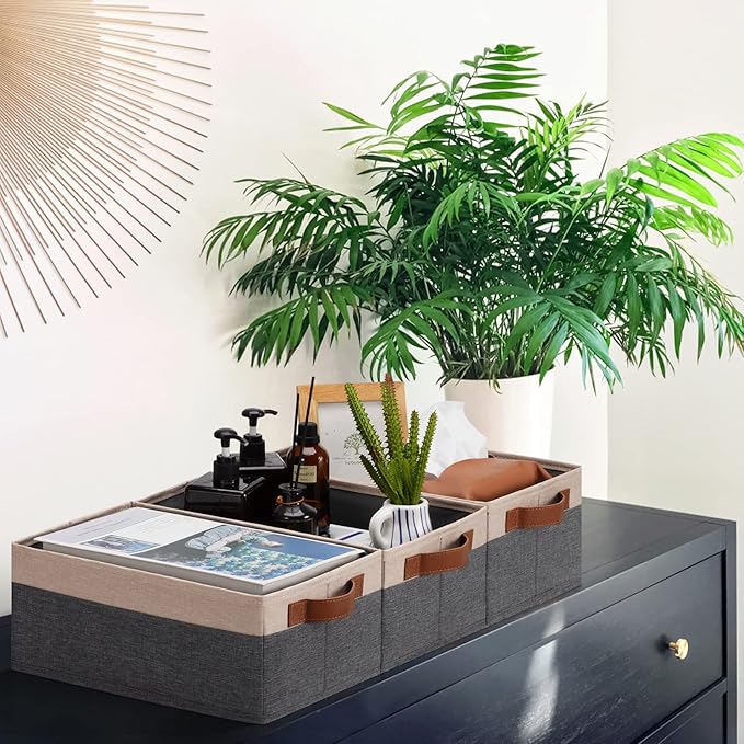- 👍【QUALITY MATERIAL】Storage baskets for shelves are made of high-quality cationic fabric and polyester cotton fabric, and the inner layer is made of non-woven fabric, which is odorless, durable and strong. Classic faux leather handles that adds a comfortable touch and provides a strong and comfort grip to pull and move. Fabric storage bins are easy to clean, just wipe with a damp sponge or cloth.