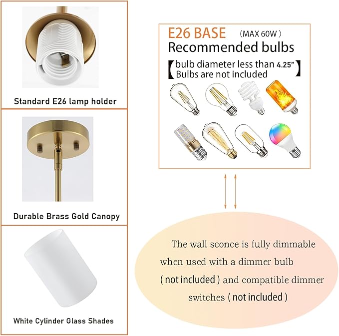- 【Perfect Size & Specific Bulb Required】Mid Century cylinder Hanging Lighting size: 20'' L x 4.72'' W x 4.72'' H. Canopy diameter 4.72”Shade diameter 4.72”. The gold ceiling light compatibles with any LED, CFL and halogen or other E26 base bulbs (Max 60W, Bulb NOT Included). It is fully dimmable when used with a dimmer bulb and compatible dimmer switches(not included) to adjust the lighting effect to your needs.