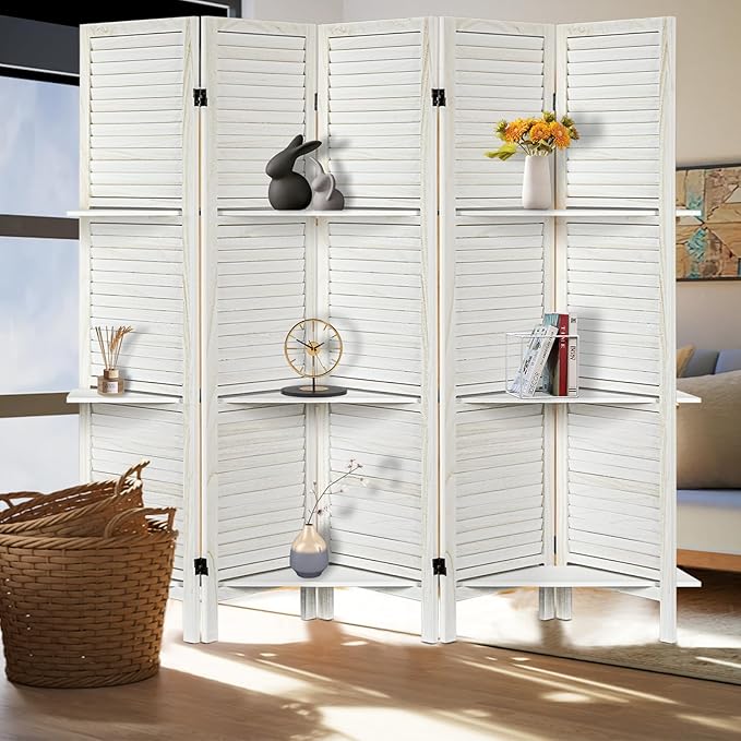 Room Divider with Shelves, Privacy Screen, Room Dividers and Folding Privacy Screens, 5 Panel Wood Temporary Wall Partition Separation Separator, White