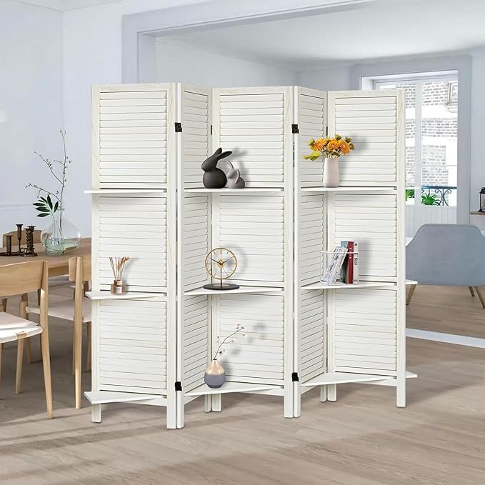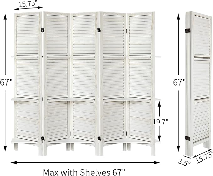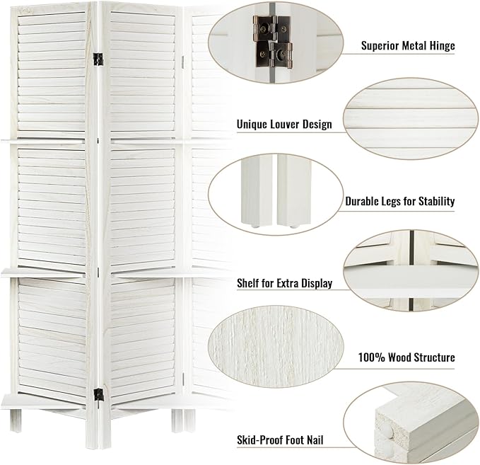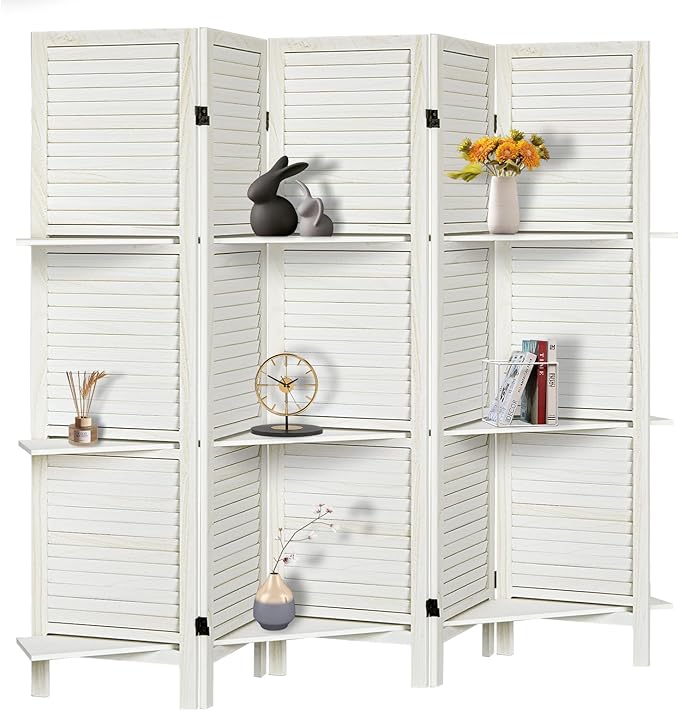 - Room Dividers with Shelves: The portable panel screen is built on solid wood, features a stylish louvered slat with 3 manufactured wood shelves to display your favorite decoratives while creating a smaller enclosed private space within a corner or along a wall.