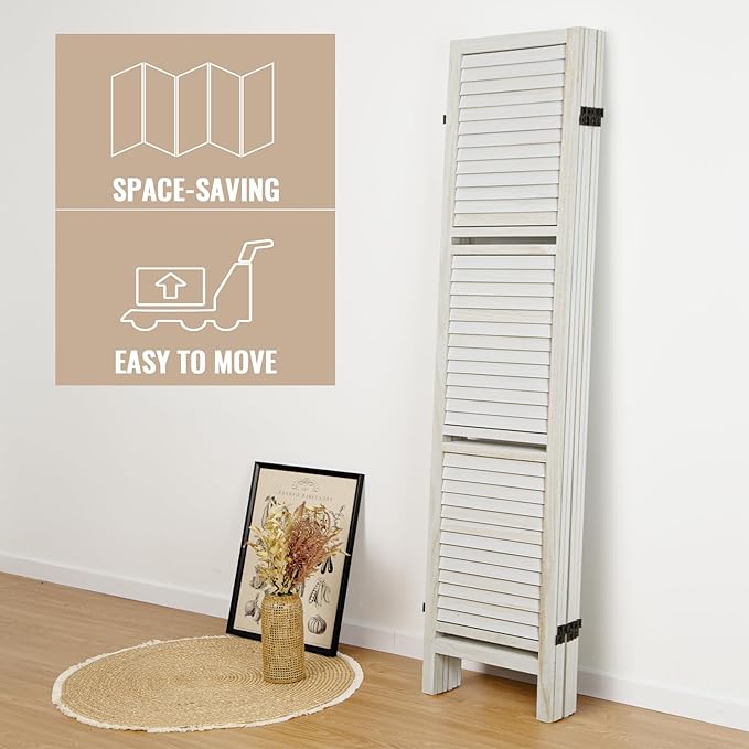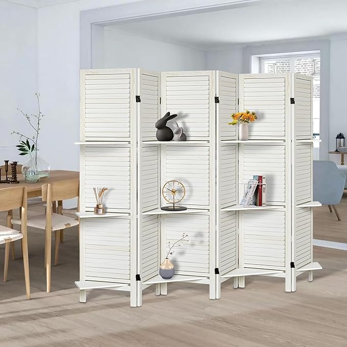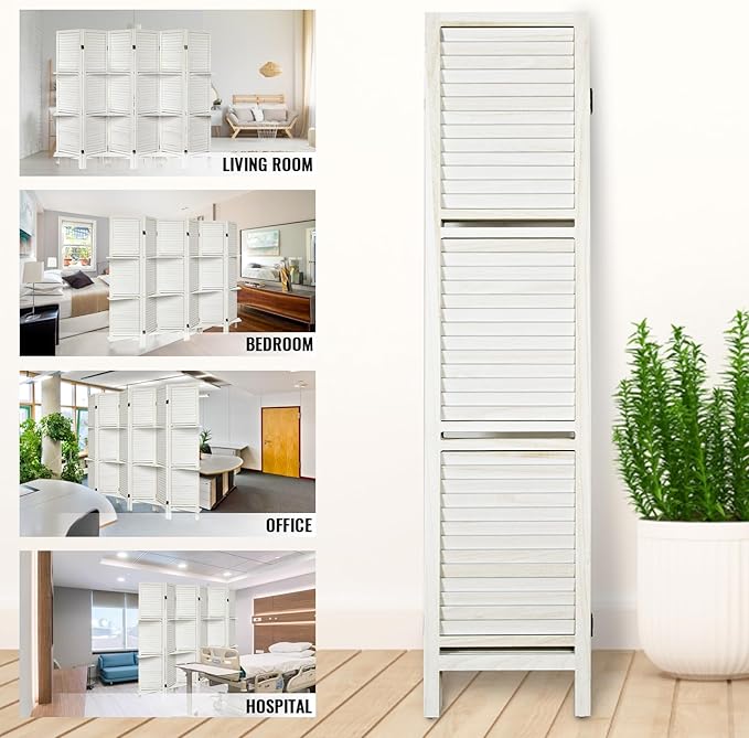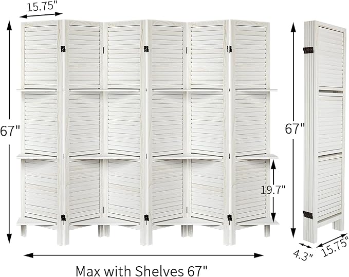 - Room Dividers with Shelves: The portable panel screen is built on solid wood, features a stylish louvered slat with 3 manufactured wood shelves to display your favorite decoratives while creating a smaller enclosed private space within a corner or along a wall.
